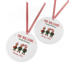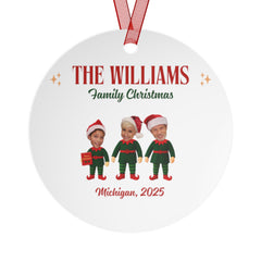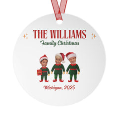A glossy white metal ornament that turns a family photo or custom illustration into a tiny holiday moment hung on the tree. Printed on both sides with vivid, chip-resistant inks, each ornament arrives with a red ribbon threaded through a pre-drilled hole so you can hang it straight away. Choose from bell, tree, round, or oval shapes to match your tree’s style. This round ornament features a warm, playful scene of three elves beneath a family name and year — a keepsake that brings a homey, lighthearted spark to your holiday décor and will mingle with twinkling lights and other memories on the branches.